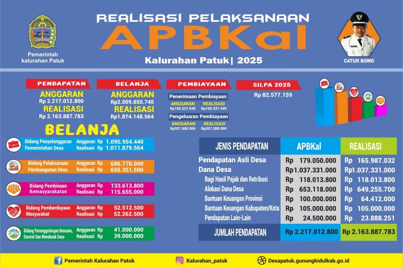Pemerintah Kalurahan Patuk menyampaikan Laporan Realisasi Anggaran Pendapatan dan Belanja Kalurahan (APBKal) Tahun Anggaran 2025 sebagai bentuk transparansi dan pertanggungjawaban kepada masyarakat.